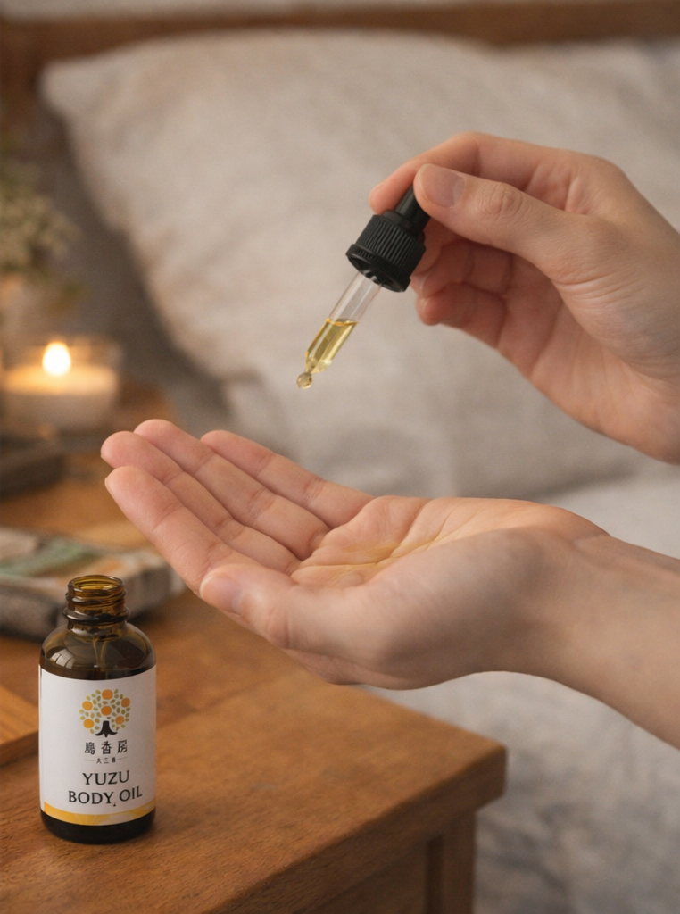 肌で香りを取り込みたい夜には、島ゆずのボディオイルを手のひらに1滴取り、両手で温めてから深呼吸を3回。手のひらを顔に優しく当てるように香りを吸い込みつつ、軽く保湿します。ゆずの温かな香りが一日の緊張をほどき、休むためのスイッチになります。
