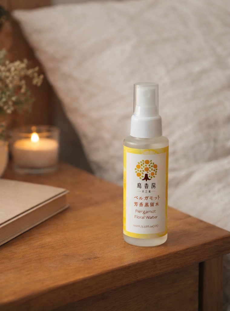 就寝前はまず空間を整えます。ベルガモットのフローラルウォーター(雑貨スプレー)は枕元や寝室の空間に1〜2回軽くスプレーして香りを楽しんでください。なお当社のベルガモット製品は水蒸気蒸留法による抽出で作られており、一般に光毒性の原因となるフロクマリン類は含まれていません(製品表示をご確認ください)。このスプレーは空間用として香りを楽しむ用途です。