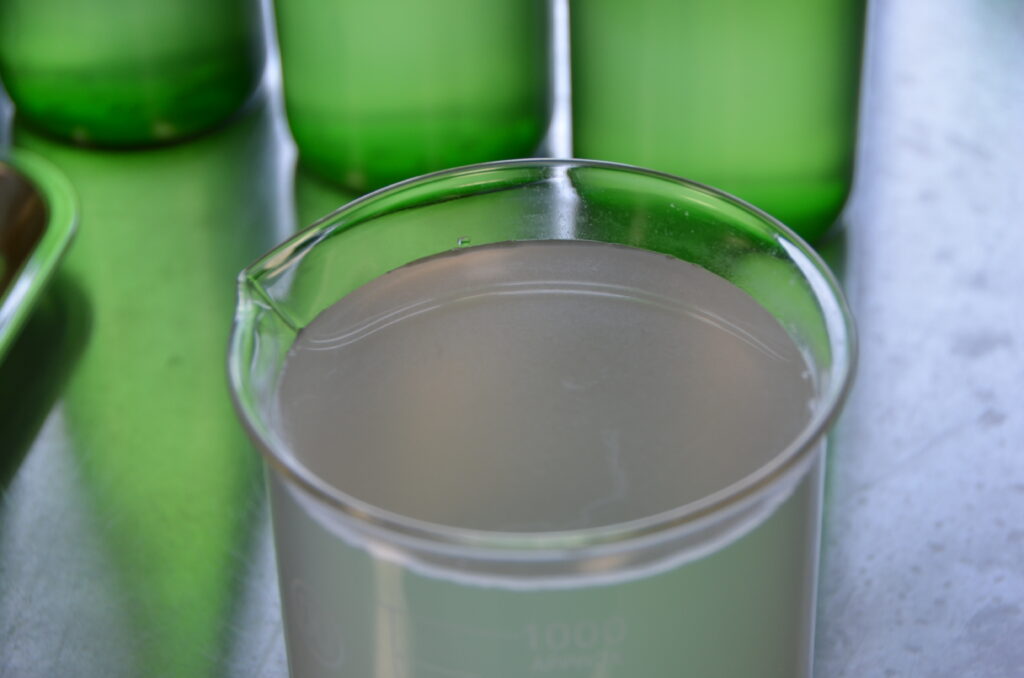 蒸留で精油と同時に抽出される芳香蒸留水(フローラルウォーター)も、私たちにとってはとても価値のある副産物です。フローラルウォーターは化粧水やハンドウォシュの原料、リネンウォーターに、無駄なく活用しています。これも「素材を最後まで生かす」島香房のものづくりの一部です。