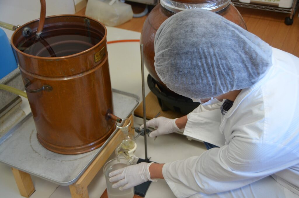 プラントのような大規模システムで大量生産に一気に蒸留する方法もありますが、島香房は少量ずつ丁寧に蒸留することを選んでいます。理由は単純で、小さなロットだと素材一つひとつの個性に寄り添えるからです。ある年はネロリの甘さが強く出る年、別の年は爽やかさが前に出る年——そんな細かな差異を見逃さずに調整できるのが小ロットの強みです。
